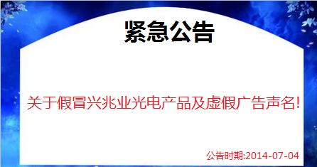 三、 嚴(yán)正聲明:凡假冒興兆業(yè)光電名義的單位或個(gè)人,必須立即停止一切侵權(quán)行為。興兆業(yè)光電保留進(jìn)一步追究其法律責(zé)任的權(quán)利。同時(shí)歡迎各位代理商、分銷(xiāo)商、消費(fèi)者和其它知情人員踴躍檢舉不實(shí)宣傳與不實(shí)銷(xiāo)售活動(dòng),對(duì)遭遇的違法行為及時(shí)報(bào)警。謝謝合作!