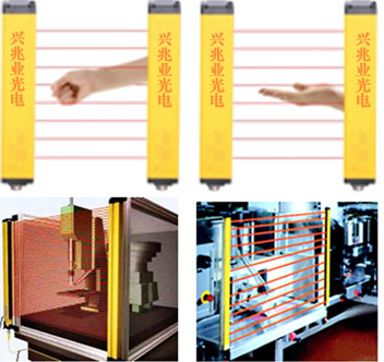 人體物體安全光幕工作原理;光幕的一邊等距離裝置有多個(gè)紅外發(fā)射管,另一邊相應(yīng)的有一樣數(shù)量相同擺放的紅外接納管,每一個(gè)紅外發(fā)射管都對應(yīng)有一個(gè)相應(yīng)的紅外接納管,且裝置在同一條直線上。